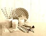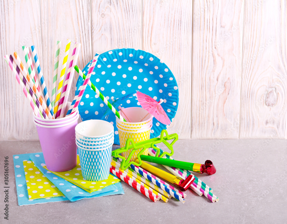 Kids party concept - paper cups, straws, plates