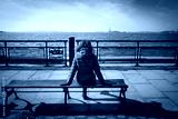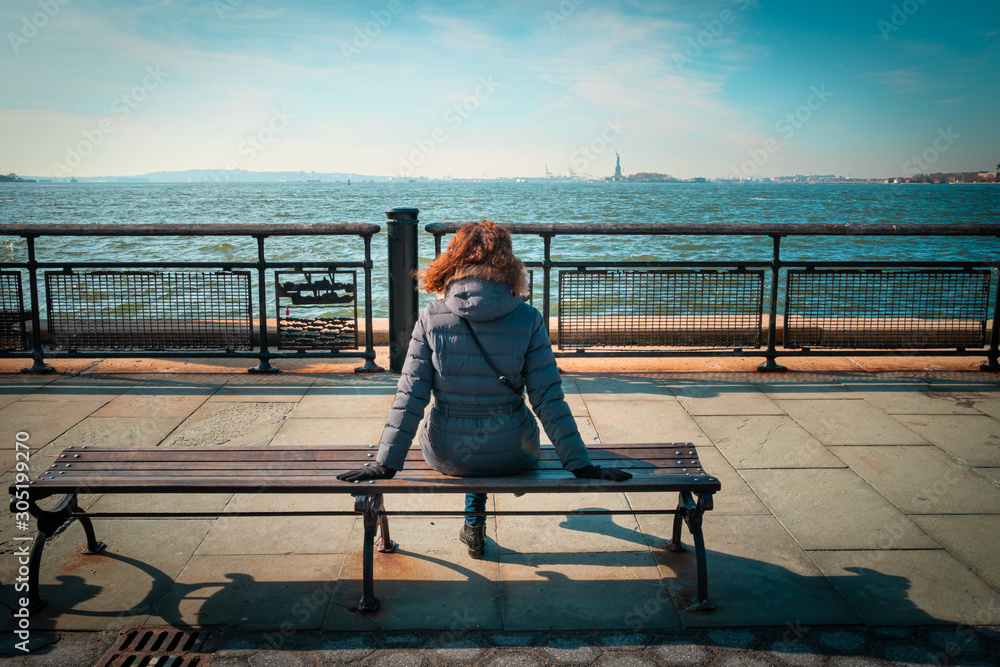 Curly brunette woman sitting on a bench and looking at the Statue of Liberty from Battery park, while sightseeing new york during winter season
