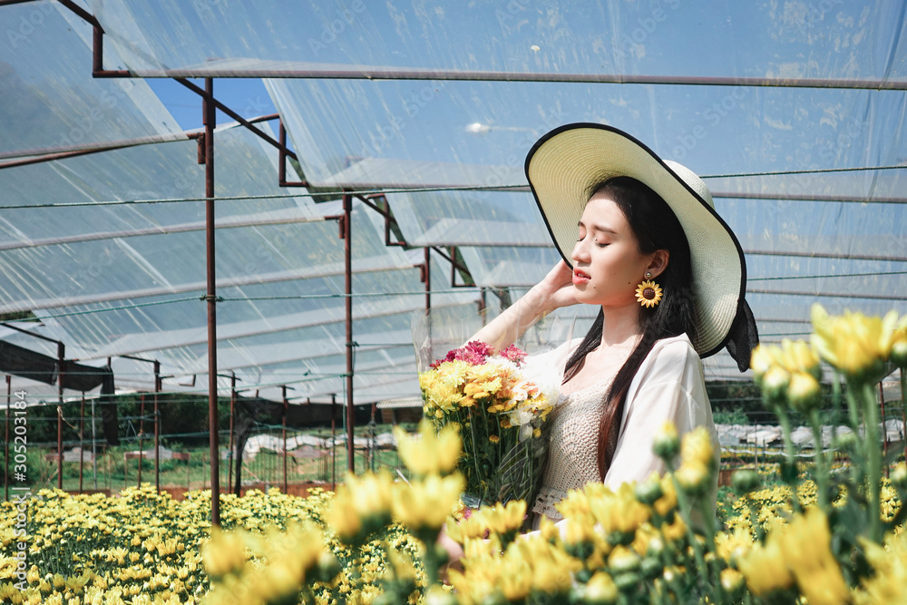Portrait young beautiful asian woman in white dress relaxing at chrysanthemum flower garden