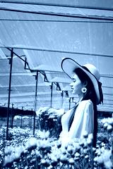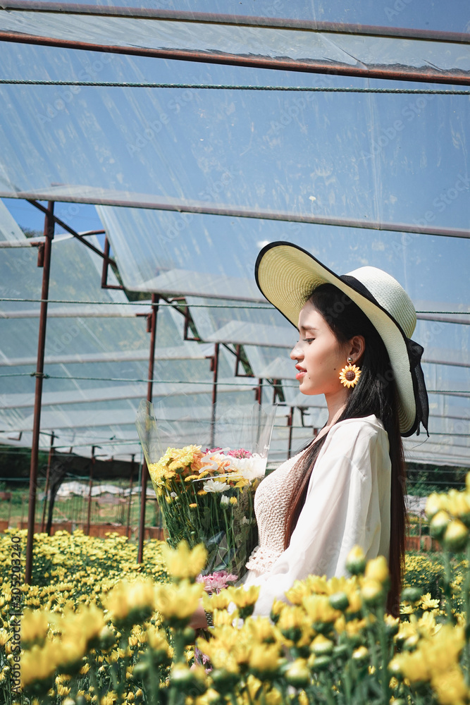 Portrait young beautiful asian woman in white dress relaxing at chrysanthemum flower garden