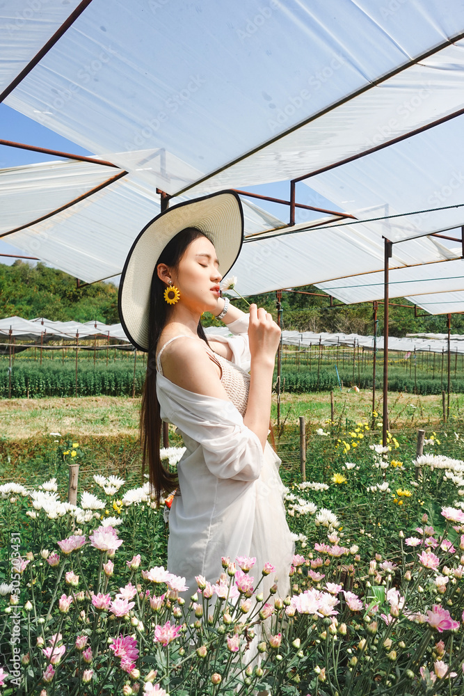 Portrait young beautiful asian woman in white dress relaxing at chrysanthemum flower garden
