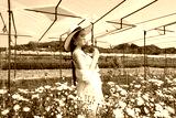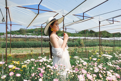 Portrait young beautiful asian woman in white dress relaxing at chrysanthemum flower garden
