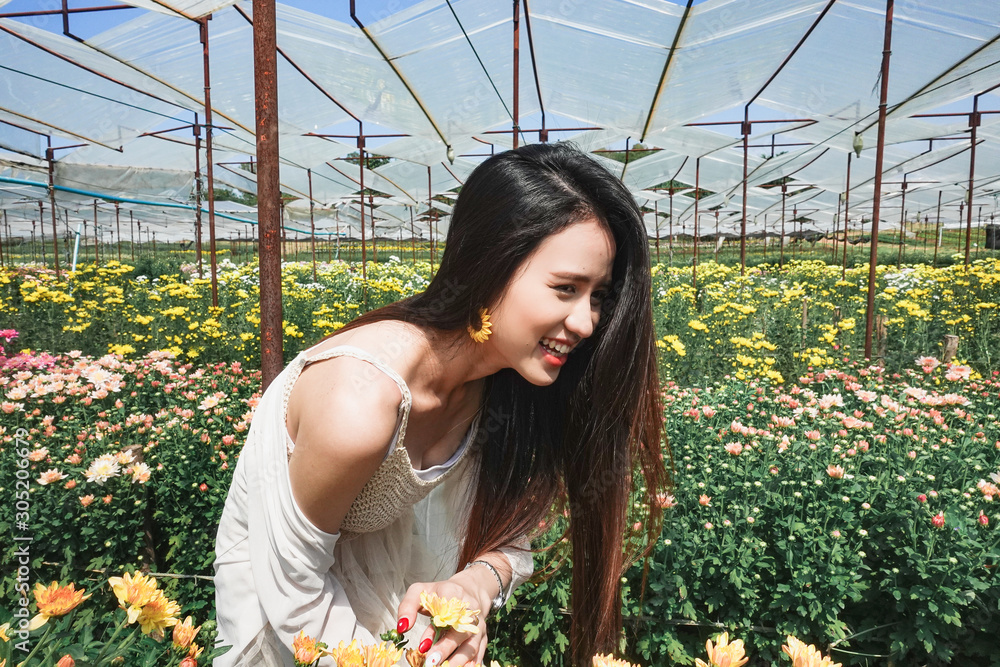 Portrait young beautiful asian woman in white dress relaxing at chrysanthemum flower garden