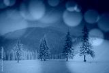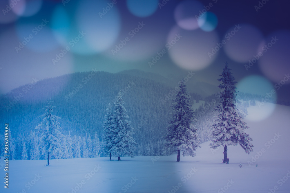 Fairy winter mountains landscape with fir trees and snowflakes. Christmas background.