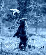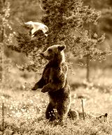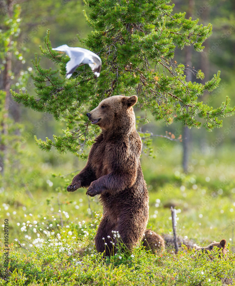 Brown bear in a forest glade is standing on its hind legs. White Nights. Summer. Finland.