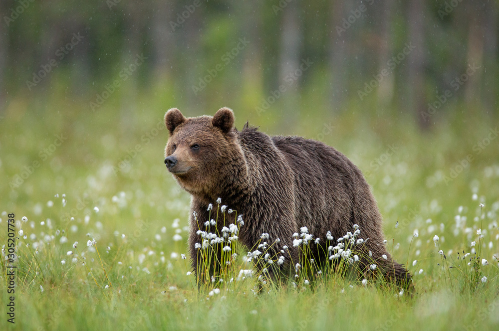 Brown bear is walking through a forest glade. Close-up. Summer. Finland.