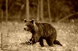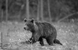 Brown bear is walking through a forest glade. Close-up. Summer. Finland.