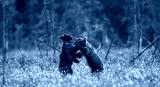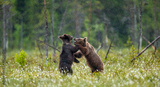 Two young brown bears are playing in a forest clearing with each other. It's raining. Summer. Finland.