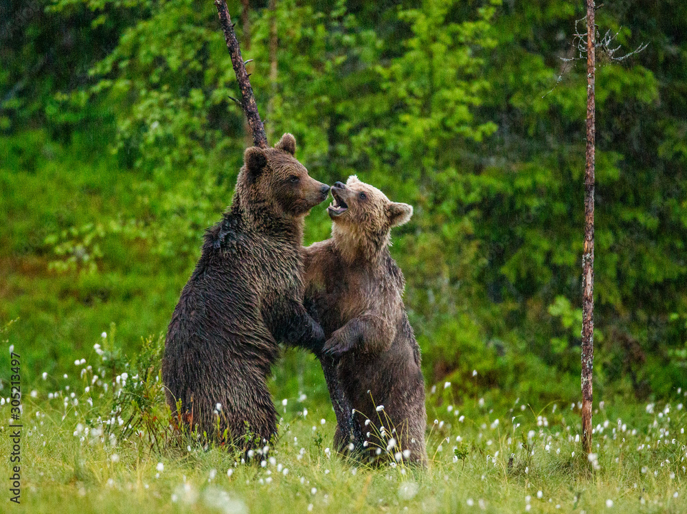 Two young brown bears are playing in a forest clearing with each other. It's raining. Summer. Finland.
