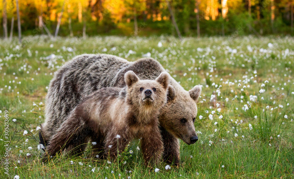 She-bear with cubs in a forest glade. White Nights. Summer. Finland.