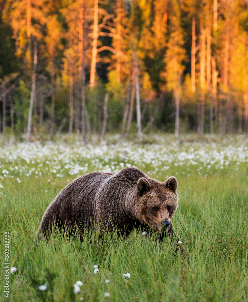 Brown bear in a clearing against the backdrop of a stunning forest with sunset. Orange paint treetops. Summer. Finland.
