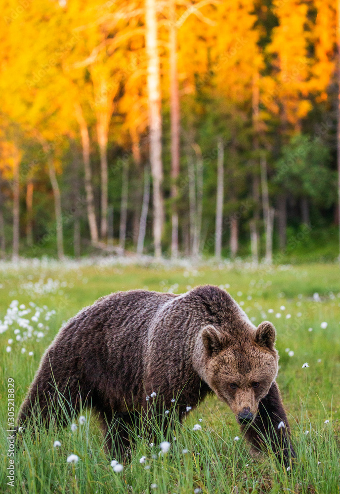 Brown bear in a clearing against the backdrop of a stunning forest with sunset. Orange paint treetops. Summer. Finland.
