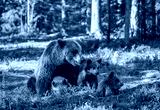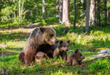 She-bear with cubs in a forest glade. White Nights. Summer. Finland.
