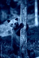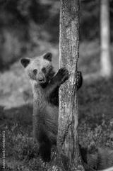 Little bear in the forest in its habitat. White Nights. Summer. Finland.