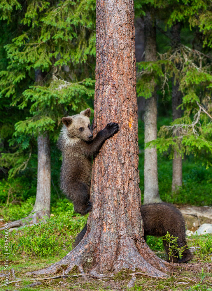 Two cubs of bear in the forest. White Nights. Summer. Finland.