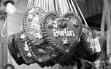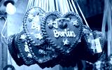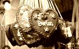 Heart shape Gingerbread cookies food on Christmas market in Europe in winter. German Night street Xmas and holiday fair in European city or town, December. Gendarmenmarkt in Berlin, Germany