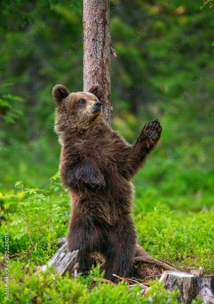 Brown bear stands near a tree in funny poses against the background of the forest. Summer. Finland.