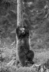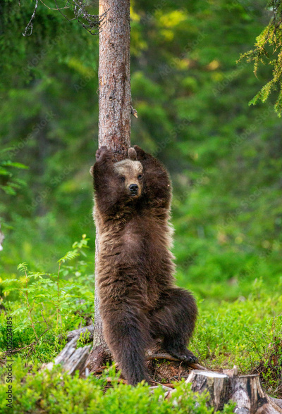 Brown bear stands near a tree in funny poses against the background of the forest. Summer. Finland.