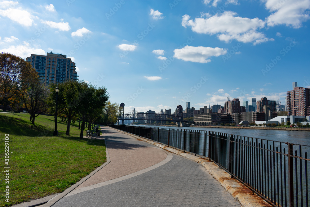 Empty Walkway at Rainey Park along the East River in Astoria Queens New York and next to the Midtown Manhattan Skyline