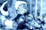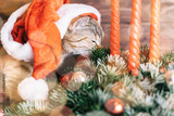 Cat in Santa Claus hat sniffing Christmas tree decoration