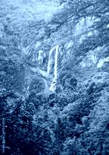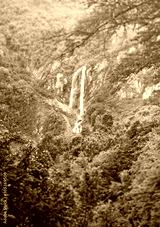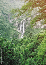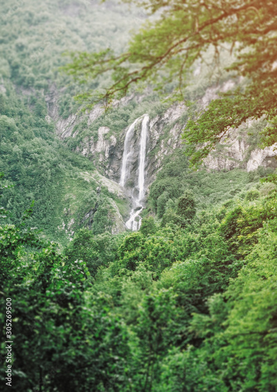 Double waterfall Polikarya in summer mountains, Russia, Sochi.
