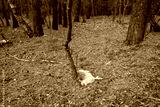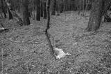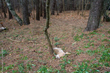 A dead gray hare lies under a tree. Death from hunger and cold in the forest. General plan.