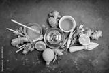 Making healthy antioxidant and anti-inflammatory ginger tea with fresh ginger, lemongrass, sage, honey and lemon on dark background with copy space. Top view.