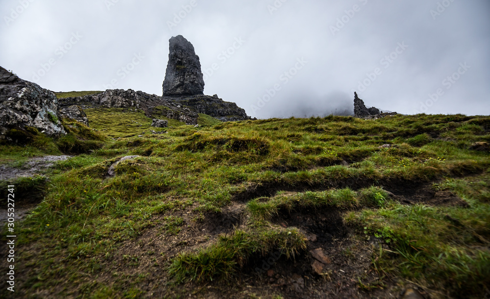 Old Man of Storr on the Isle of Skye in Scotland. Mountain landscape with foggy clouds.