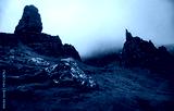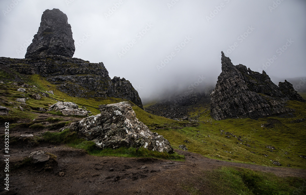 Old Man of Storr on the Isle of Skye in Scotland. Mountain landscape with foggy clouds.