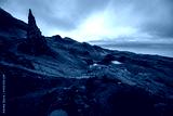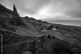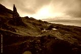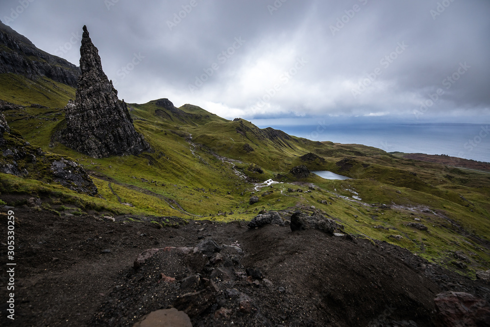 Old Man of Storr on the Isle of Skye in Scotland. Mountain landscape with foggy clouds.