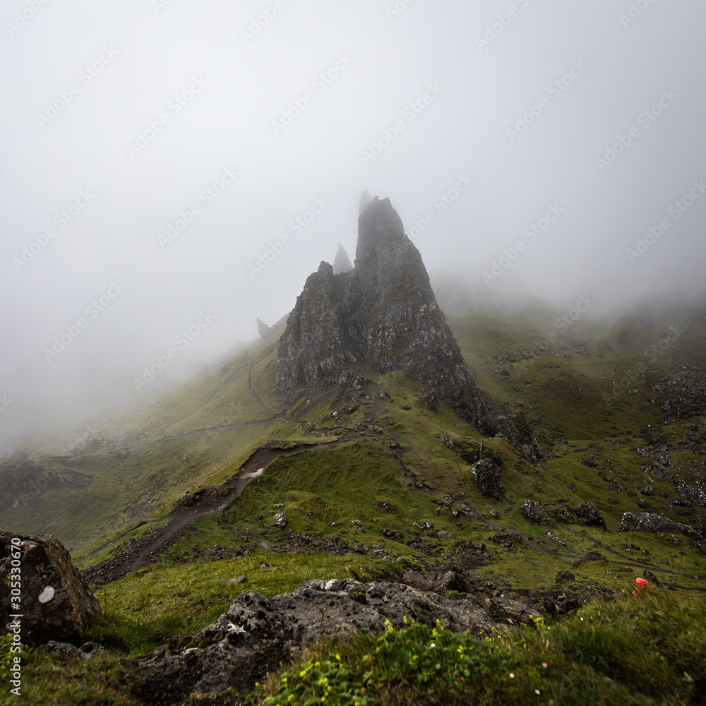 Old Man of Storr on the Isle of Skye in Scotland. Mountain landscape with foggy clouds.