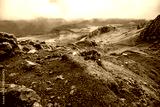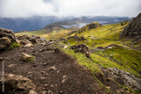 Old Man of Storr on the Isle of Skye in Scotland. Mountain landscape with foggy clouds.
