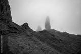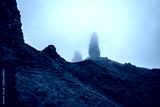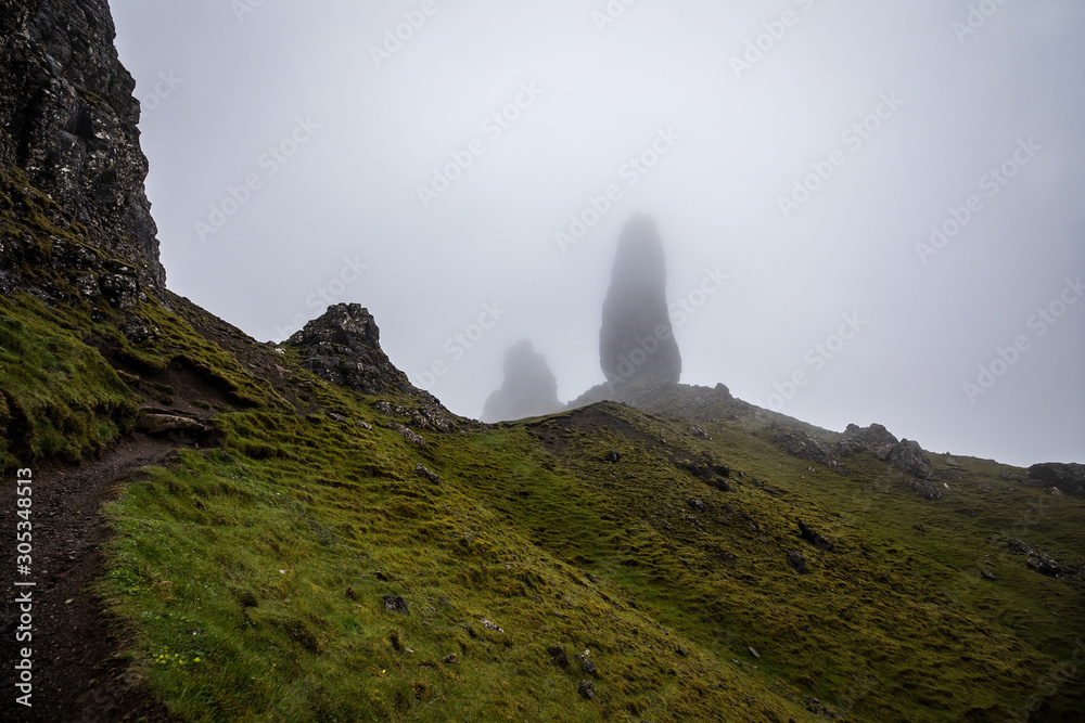 Old Man of Storr on the Isle of Skye in Scotland. Mountain landscape with foggy clouds.