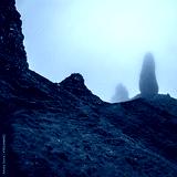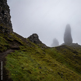 Old Man of Storr on the Isle of Skye in Scotland. Mountain landscape with foggy clouds.