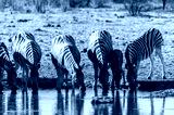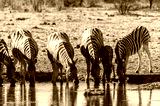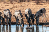 A group of Burchell's Plains zebra -Equus quagga burchelli- drinking from a waterhole in Etosha National Park, Namibia.