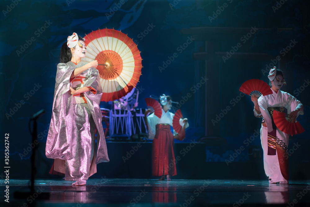 Traditional Japanese performance. Actresses in traditional white and red kimono and fox masks dancing with umbrella and fans.