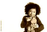 Happy adorable african american child girl with christmas gift in hands isolated on white background