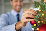 Business man decorating christmas tree at office