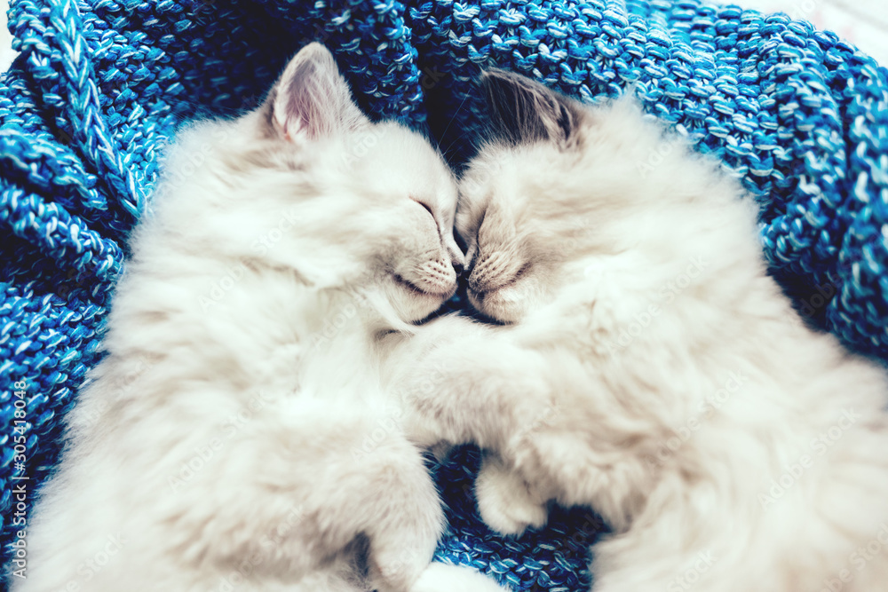 Two Ragdoll cats, small funny kittens sleeping together on blue blanket