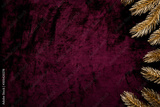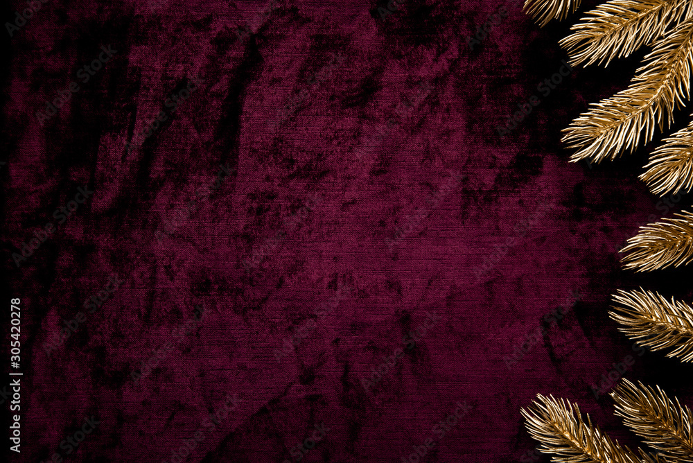 Christmas and New Year holiday background. Xmas greeting card. Christmas golden ornaments on purple background top view. Flat lay