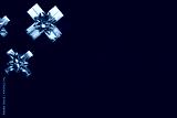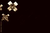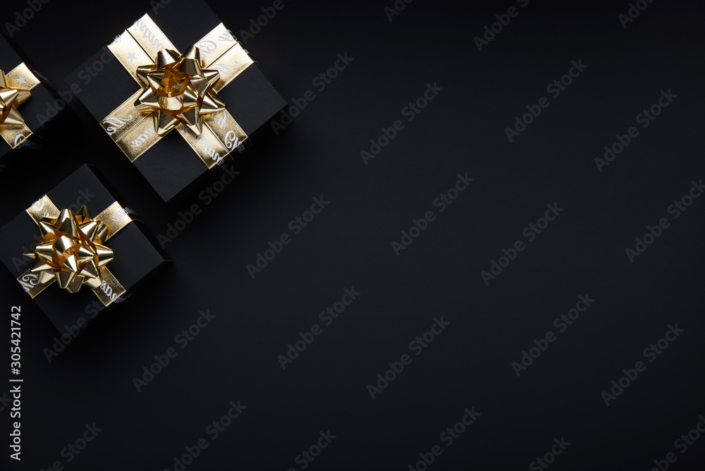 Merry Christmas and Happy Holidays greeting card, frame, banner. New Year. Noel. Christmas golden ornaments and gift on black background top view. Winter xmas holiday theme