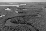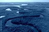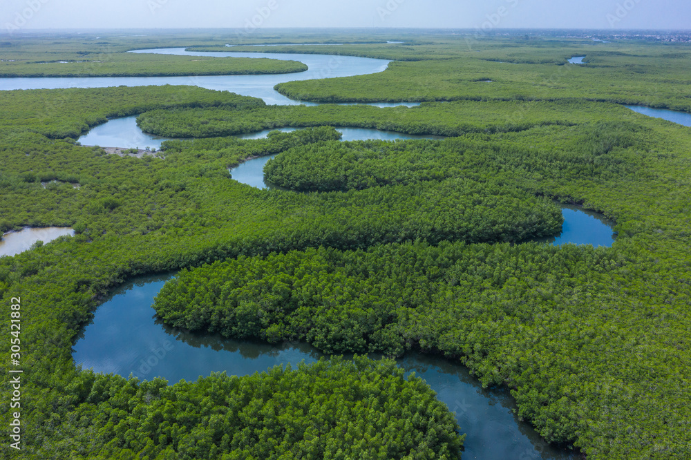 Aerial view of mangrove forest in Gambia. Photo made by drone from above. Africa Natural Landscape.