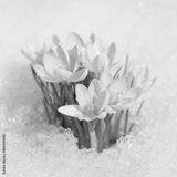 Crocuses yellow blossom on a spring sunny day in the open air. Beautiful primroses against a background of brilliant white snow.