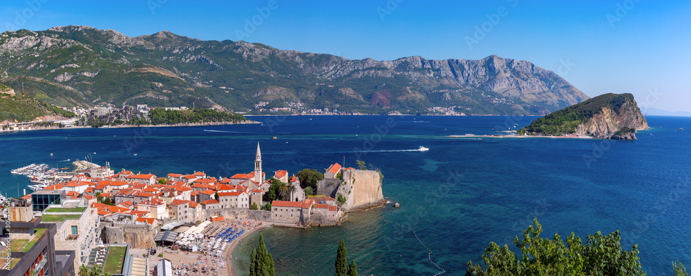 Panoramic aerial view of The Old Town of Montenegrin town Budva on the Adriatic Sea, Montenegro
