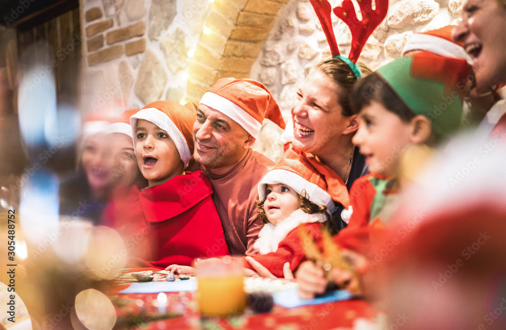 Multi generation family on santa hat clothes having fun at christmas fest house party posing for group photo - Winter holiday x mas concept with parents and children eating together - Warm red filter