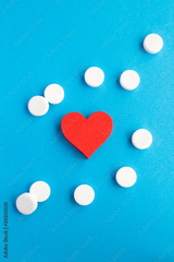 Red heart and white pills on the blue background. Top view. Copy space. Location vertical.