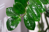 A branch of a home flower with large shiny green leaves. Zanzibar Gem plant on a white wall background. zamioculcas with thick bright green leaves.