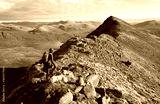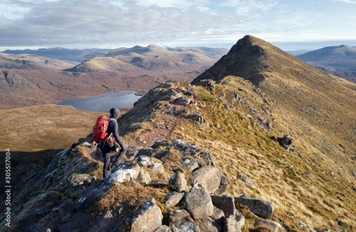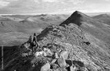 A hiker walking over the narrow ridge that leads to Sgurr an Tuill Bhain with Lochan Fada in the distance in the Scottish Highlands.