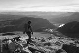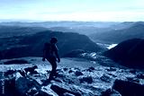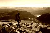 A hiker and their dog descending Sgurr an Tuill Bhain towards Coire na Sleaghaich above Kinlochewe in the distance in the Scottish Highlands.