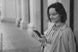 Portrait of attractive business woman checking messages on smartphone using 4g wireless for networking with sunset light glowing on left side